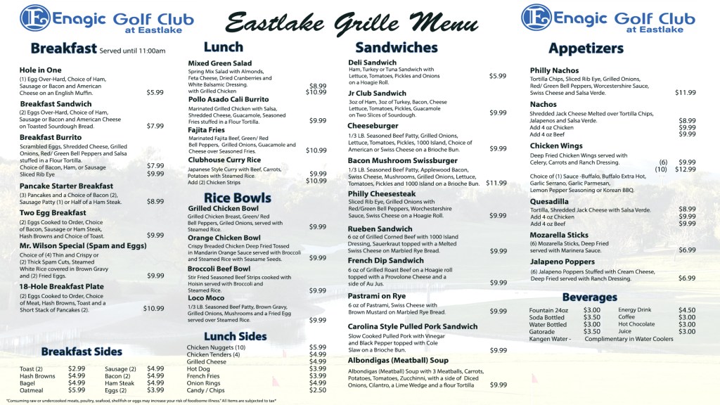 Eastlake Grille Home Facilities Eastlake Grille The Grille is the perfect way to end your next round at Enagic Golf Club. Enjoy a delicious meal and your favorite beverage while enjoying the beautiful views of not only the course, but our FANTASTIC San Diego Sunsets.